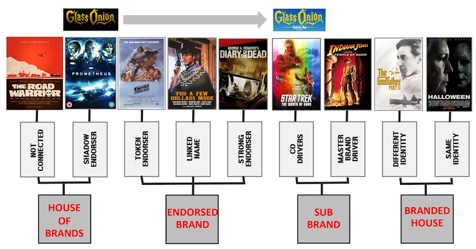 But this plan was upended by Netflix, the producers of Glass Onion. They did not want the kind of independence that shadow endorsement conferred and were looking for a more solid connection to the original movie. The studio therefore opted to make Glass Onion a sub-brand of the Knives Out masterbrand and ensure the marketing of the new movie positioned it clearly as such.