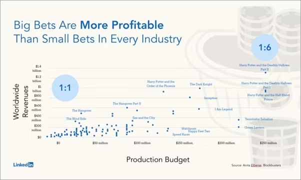 But over the last four decades, Hollywood has gradually realised that ‘big bet’ movies usually based on existing franchises are easier to sell, more efficient to market, significantly more likely to attract audiences and way more profitable. Six times more profitable if you follow the work of Professor Anita Elberse from Harvard Business School. If you want a perfect illustration of how the big bet theory applies to the world of marketing, invest five minutes watching LinkedIn’s Jon Lombardo explain it all in a fantastically inexplicable body warmer.