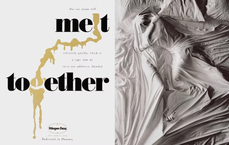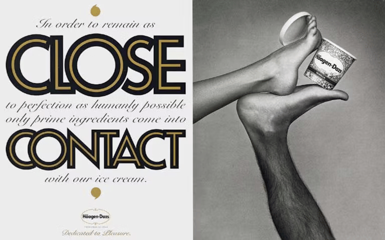 Copywriter Larry Barker scoured Pillsbury production manuals in which the company talked about the incredible care that went into the ingredients and manufacturing of Häagen-Dazs. He selected the most appropriate quotes and then, with a stroke of his pen, enlarged the words that also had an adult, sensuous connotation. This unusual copy was twinned on the other side of the page with photography from Jeanloup Sieff. Couples were shown using the product in adult, sensuous, pleasurable ways. Choosing Sieff, the great French fashion photographer, over the usual food photography options was a masterstroke because he was renowned for his sensual, arresting eye. And he looked at ice cream in an adult way.