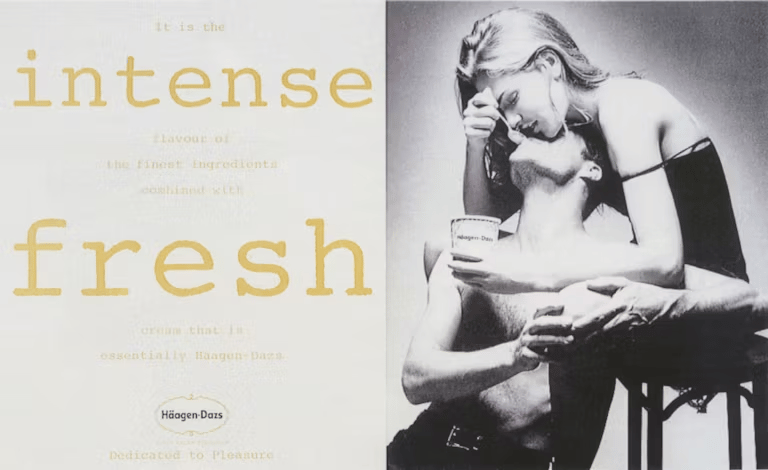 But that weakness in the ice cream category became an opportunity for Häagen-Dazs. When Pillsbury decided to target the UK market in 1990, initial product tests on consumers sparked a series of important insights. Consumers were surprised by the opulent taste of cream and the indulgence that came with it. Many also began to question what was in the yellow shit they had been mistaking for ice cream thus far in their life. Indeed, so indulgent and pleasurable was the new experience, several consumers talked openly of feeding their partners with Häagen-Dazs and generally using it as a prelude to further intimacy. Things people hadn’t done with Lyons Maid or Funny Feet started to happen with Häagen-Dazs.