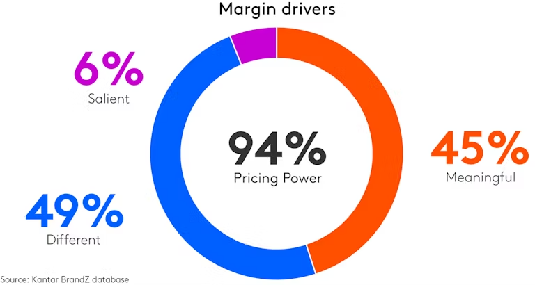 And that’s important, because while distinctiveness and salience are much bigger drivers of overall demand, differentiation is a much bigger driver of margin. The empirical work of Kantar should be instructive here. Again, I’m not saying one of these D-words is more important than the other. I am saying you want both differentiation and distinctiveness. To drive volumes. And to drive volumes at a better, sustainable price point.